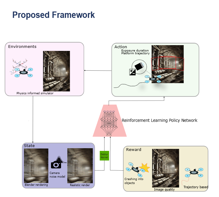 Employing reinforcement learning to develop control policies and reward structures that enable robotic platforms to autonomously navigate environments, avoid collisions, and execute motion and exposure parameters for engineered blur capture.